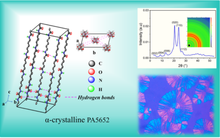 貴大新聞網訊(材料與冶金學院)近日,我校材料與冶金學院劉玉飛特聘教授團隊在生物基聚酰胺材料研究領域取得重要突破,相關成果以 Biobased Polyamide 5652 with α?Crystal Form: Characterization and Low Moisture Absorption為題,發(fā)表于高分子領域頂級期刊Macromolecules(自然指數期刊,中科院一區(qū)TOP)。貴州大學材料與冶金學院為論文第一完成單位,材料與冶金學院2022級碩士研究生王艷平為第一作者,劉玉飛特聘教授為通訊作者。近年來,生物基聚酰胺56(PA56)因其原料可再生、低碳環(huán)保而備受關注,但其特殊的分子結構(戊二胺單元含奇數碳原子)導致其晶體通常以γ晶型為主,飽和吸水率高達12%以上,在潮濕環(huán)境中力學性能顯著下降(如拉伸強度降低20%-30%),嚴重限制了在精密工程領域的應用,而傳統改性方法往往以犧牲材料其他性能為代價。針對這一難題,劉玉飛特聘教授創(chuàng)新性地提出了雙氫鍵結構調控策略:自主合成關鍵單體,設計并成功合成新型565二胺單體(C16H34N4O2),將565二胺與草酸二丁酯通過溶液聚合及
